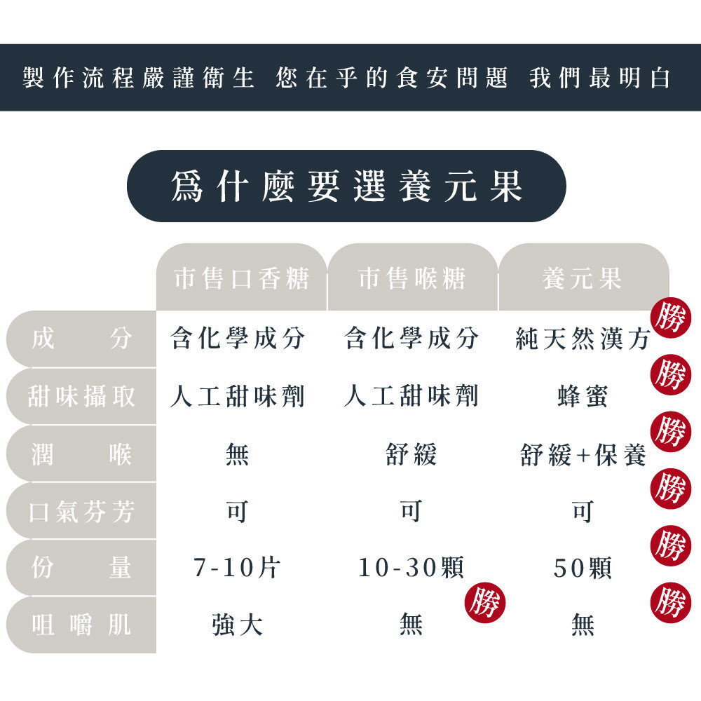 我們始終堅持: 選用上等藥材,細火慢煉的製程,保留熟悉的漢方潤喉口感與功效